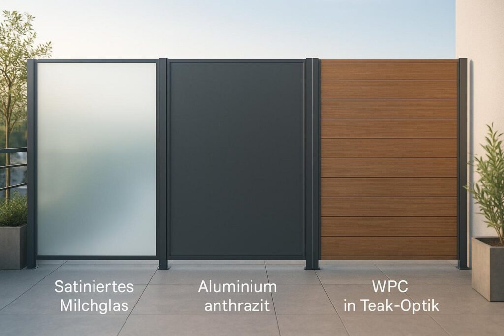 Das Material bestimmt zu einem großen Teil den Stil. WPC (Wood-Plastic-Composite) verbindet die Optik von Holz mit der Haltbarkeit von Kunststoff und ist sehr pflegeleicht. Glaselemente, oft als Milchglas, wirken modern und elegant, lassen Licht durch, verhindern aber direkte Einblicke. Aluminium sorgt für einen klaren, eher industriellen Look und ist sehr langlebig.