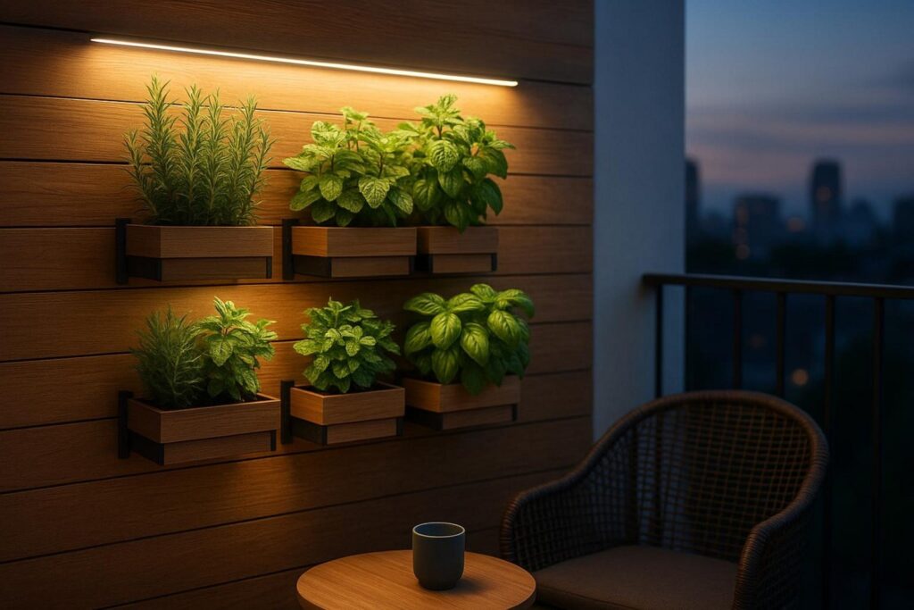 Sehr gefragt ist aktuell Vertical Gardening in Kombination mit Sichtschutz. Regalsysteme oder Palettenwände dienen zugleich als Halterung für Kräutertöpfe und als blickdichte Fläche. Beliebt ist auch die Integration von LED-Beleuchtung direkt in den Sichtschutz (z.B. bei WPC-Elementen). So entsteht abends ein angenehmes, indirektes Licht.