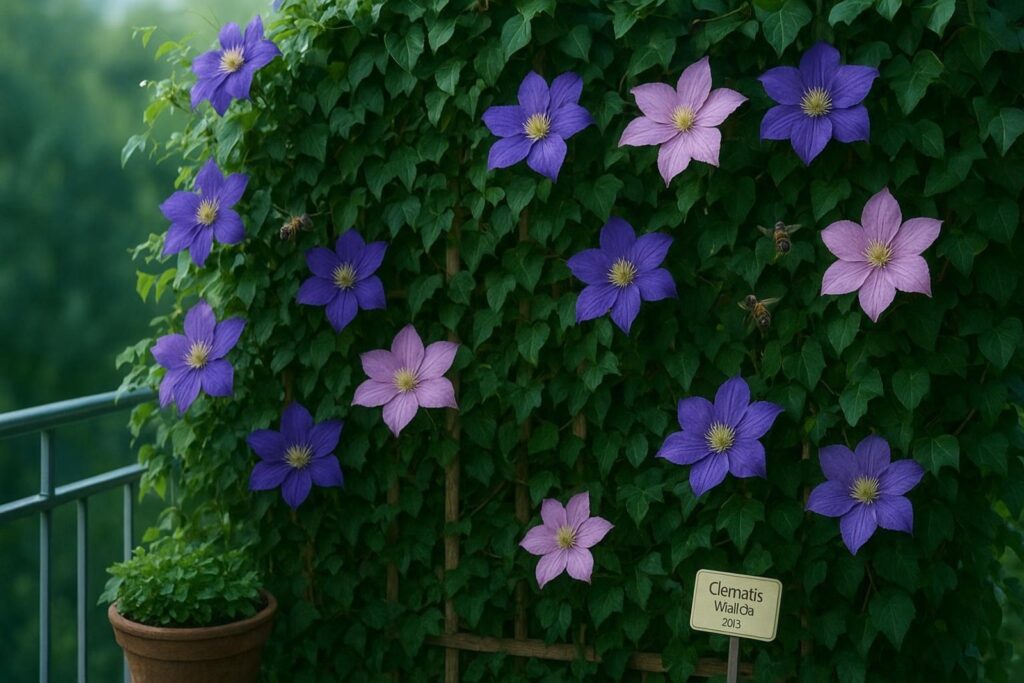 Wer es besonders natürlich mag, kann Pflanzen als „lebende Wand“ einsetzen. Hoch wachsende Gräser wie Bambus (im Kübel!) oder Chinaschilf bieten einen dichten, im Wind raschelnden Schutz. Rankgitter mit Clematis, Efeu oder wildem Wein bilden nach einiger Zeit eine grüne Wand, verbessern das Klima und ziehen Bienen an.