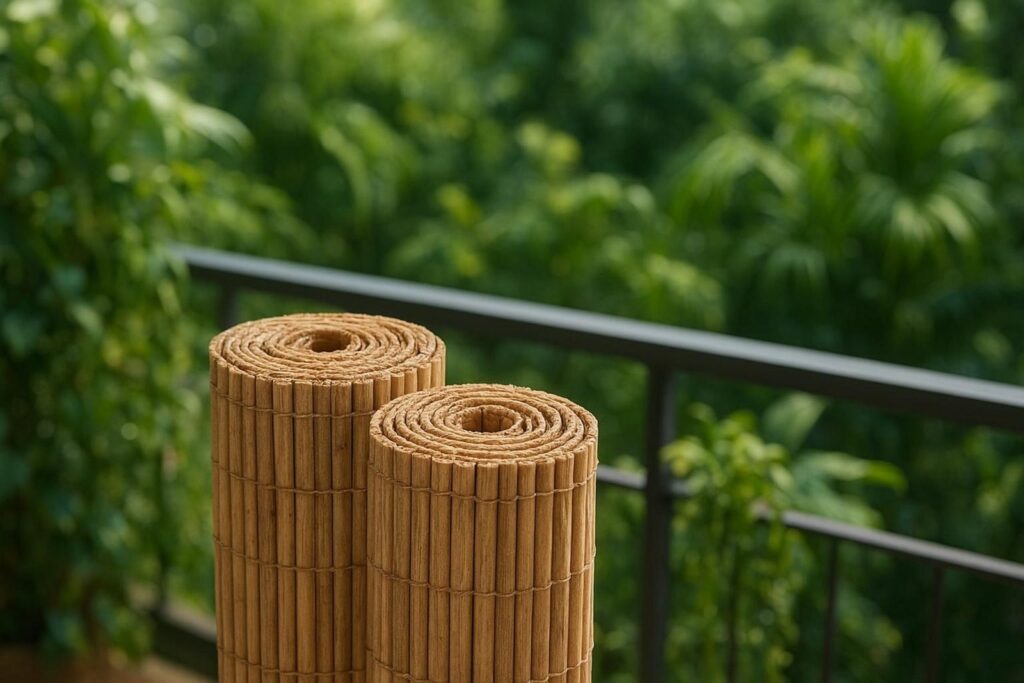 Materialien aus der Natur wie Holz, Bambus, Weide oder Schilfrohr gehören zu den Klassikern. Sie wirken warm und fügen sich gut in eine grüne Umgebung ein. Besonders Bambusmatten sind beliebt, da sie haltbar, witterungsbeständig und relativ leicht sind. Je nach Holzart entsteht ein eher exotischer oder rustikaler Eindruck.