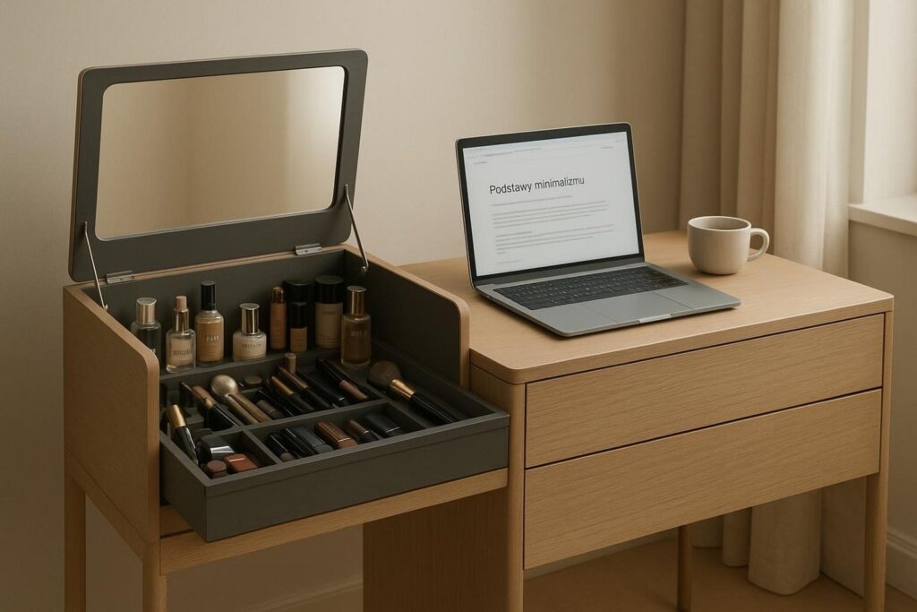 In Schlafzimmern sind zunehmend auch Schminktische zu finden. Mit praktischen Aufbewahrungsmöglichkeiten für Kosmetik helfen sie, Ordnung im Badezimmer zu halten und können nach dem Schließen der Platte als kleines Schreibtisch für Homeoffice genutzt werden. Das Kombinieren mehrerer Funktionen in einem Möbelstück ist ein Merkmal des heutigen Designs, das Platzersparnis ohne Verlust der ästhetischen Anziehungskraft bietet.